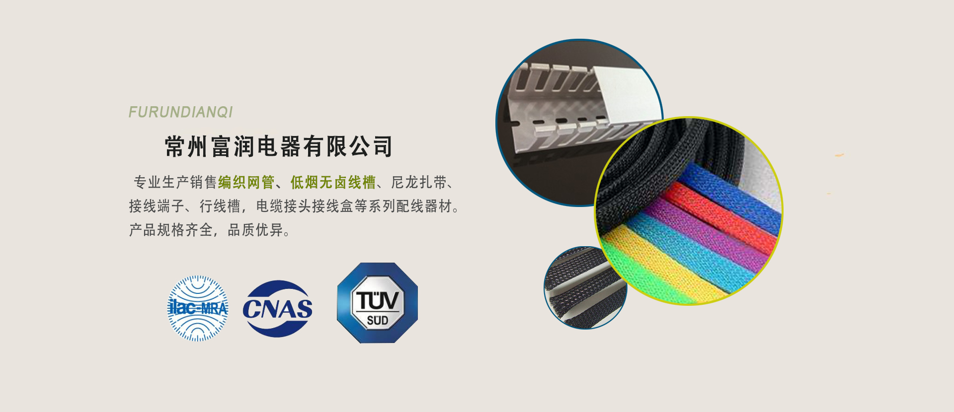 常州富潤(rùn)電器有限公司專業(yè)生產(chǎn)、銷售編織網(wǎng)管、尼龍?jiān)鷰А⒔泳€端子、行線槽,電纜接頭接線盒等系列配線器材···